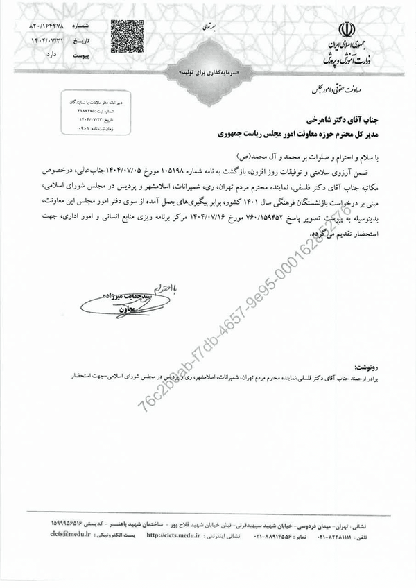 پیمان فلسفی، نمایندهٔ تهران، ری، شمیرانات، اسلامشهر و پردیس در مجلس شورای اسلامی، در نامهای به تاریخ پنجم مهرماه خطاب به مسعود پزشکیان، رئیسجمهور، خواستار رسیدگی فوری و اجرای کامل «قانون رتبهبندی معلمان» برای بازنشستگان فرهنگی سال ۱۴۰۱ شد.در این نامه بر این موضوع تأکید شده که مبلغ کامل ناشی از رتبهبندی باید بهصورت مجزا از میانگین درآمد 2 سال آخر خدمت برای بازنشستگان فرهنگی محاسبه و همراه با معوقات سه سال اخیر به طور کامل پرداخت شود.در ادامه، وی در گفتوگو با خبرنگار پارلمانی خبرگزاری فارس، با اشاره به دریافت پاسخ به نامهٔ خود، در خصوص آخرین وضعیت رتبهبندی معلمان اظهار داشت: بر اساس پاسخ دفتر برنامهوبودجه، مشکل بازنشستگان نیمه دوم سال ۱۴۰۰ کاملاً مرتفع شده است. با برگزاری جلسات با صندوق بازنشستگی کشوری، میزان بدهی وزارت آموزشوپرورش به این صندوق بهدقت محاسبه و مبلغ مربوط به کسورات و حق رتبهبندی بازنشستگان از پایان شهریور ۱۴۰۰ به بعد، به طور کامل پرداخت شده است.نماینده تهران ادامه داد: صندوق بازنشستگی نیز متعاقباً احکام حقوقی جدید این عزیزان را صادر و معوقات آنان را پرداخت کرده است. بازنشستگان محترم میتوانند برای پیگیری وضعیت خود به دفاتر استانی صندوق بازنشستگی مراجعه کنند.