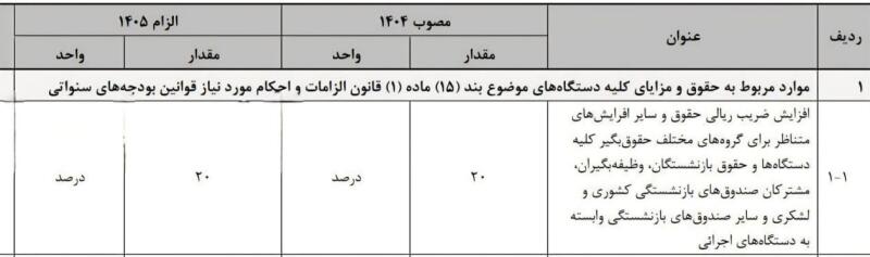 به گزارش خبرگزاری تسنیم، لایحه بودجه سال 1405 کل کشور با پیشبینی افزایش حقوق کارکنان ارائه شد. بر اساس این لایحه، میزان افزایش ضریب ریالی حقوق سایر افزایش متناظر برای گروههای مختلف حقوق بگیر کلیه دستگاههای اجرایی 20 درصد تعیین شده است.
