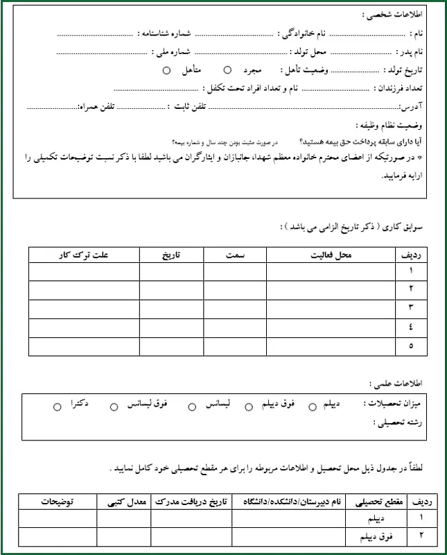 پس از دانلود فرم دعوت به همکاری، اطلاعات خواسته شده از جمله اطلاعات هویتی، سوابق تحصیلی، مهارتهای فنی، سوابق فعالیتهای حرفهای خود را وارد نمایید.