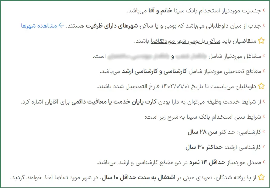 شرایط استخدام بانک سینا | آبان 1404