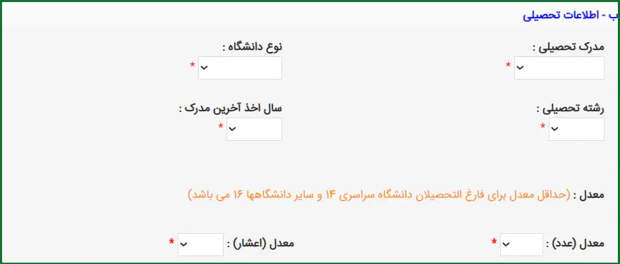 این بخش مربوط به اطلاعات سوابق تحصیلی است که باید در آن، مدرک تحصیلی، نوع دانشگاه، رشته تحصیلی، سال اخذ مدرک و.. را از میان گزینههای موجود انتخاب نمایید.