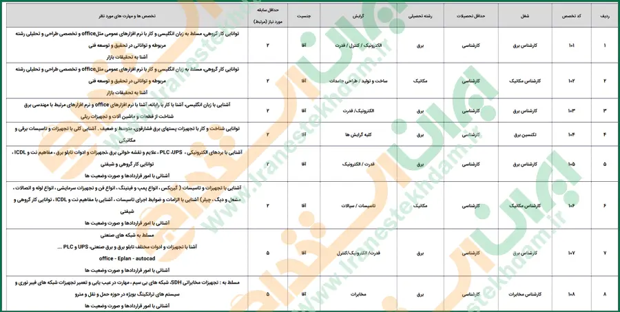 | 8 | 108 | کارشناس مخابرات | کارشناسی | برق | مخابرات | آقا | 5 | مسلط به : تجهیزات مخابراتی SDH، شبکه های بی سیم ، مهارت در عیب یابی و تعمیر تجهیزات شبکه های فیبر نوری و سیستم های ترانکینگ بویژه در حوزه حمل و نقل و مترو آشنائی با امور قراردادها و صورت وضعیت ها |