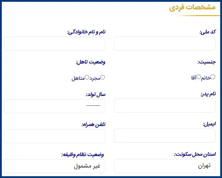پس از ورود به صفحه فرم استخدام، اطلاعات هویتی خود شامل کد ملی، نام و نام خانوادگی، جنسیت، وضعیت تأهل، آدرس ایمیل و سایر مشخصات خواستهشده را بهصورت کامل و دقیق وارد نمایید.
