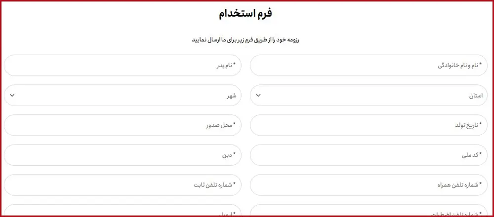 توجه: این فرم استخدام بر اساس نسخه دسکتاپ طراحی و تنظیم شده است؛ بنابراین ممکن است در تلفن همراه با تغییراتی در نمایش یا چیدمان مواجه شوید. بهمنظور سهولت در تکمیل فرم، توصیه میشود از رایانه استفاده نمایید.