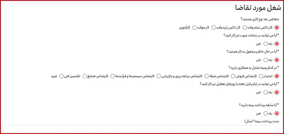 پس از تکمیل اطلاعات فردی، بر اساس موقعیت شغلی انتخابشده، به سوالات تخصصی و موارد خواستهشده مرتبط با آن شغل پاسخ دهید.