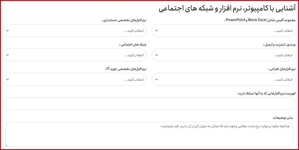 میزان آشنایی و تسلط خود بر نرمافزارهای عمومی، تخصصی، طراحی، حسابداری و شبکههای اجتماعی را مشخص کرده و در صورت نیاز توضیحات تکمیلی را در کادر مربوطه وارد نمایید.