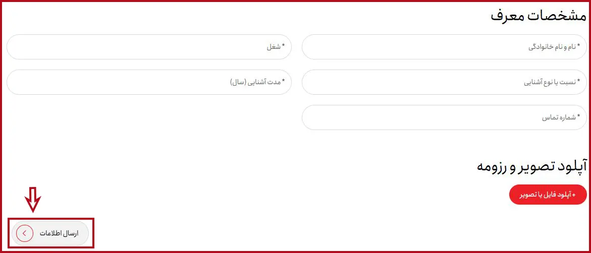 پس از تکمیل تمامی بخشها، در صورت وجود، اطلاعات معرف را وارد کرده و فایل رزومه خود را بارگذاری نمایید. در پایان با انتخاب گزینه «ارسال اطلاعات»، درخواست استخدام خود را نهایی و ثبت کنید.