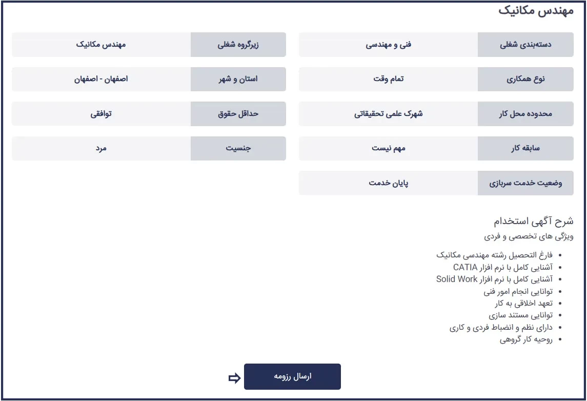 پس از بررسی توضیحات شغلی و اطمینان از تطابق آن با مهارتها و سوابق کاری خود، روی دکمه "ارسال رزومه" کلیک نمایید.