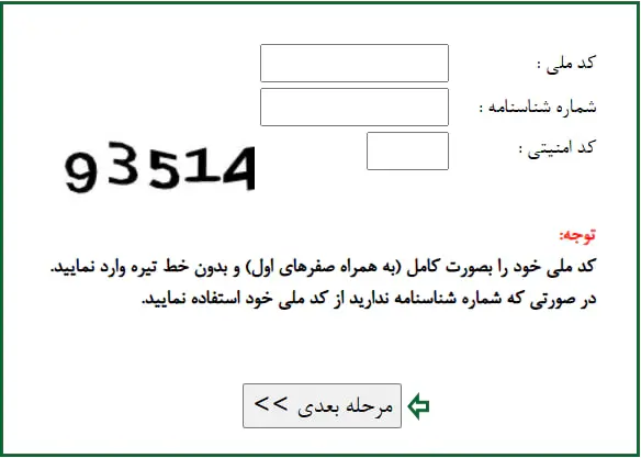 در این مرحله باید کد ملی، شماره شناسنامه و کد امنیتی را وارد کرده و سپس روی دکمه "بعدی" کلیک نمایید.