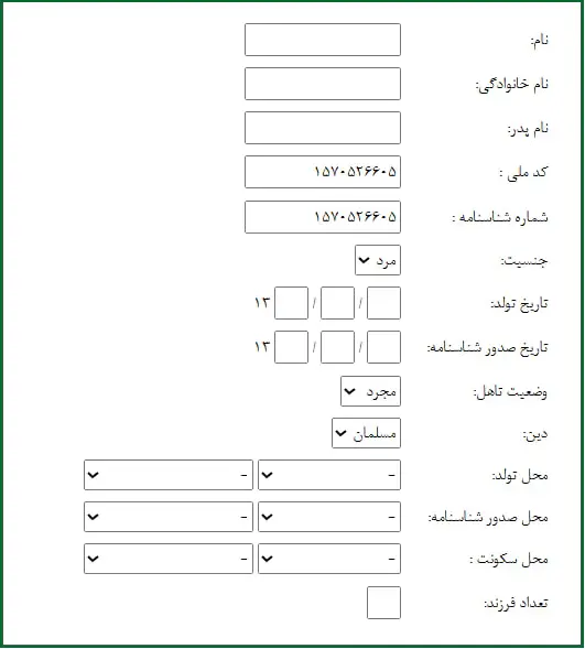 در این بخش باید اطلاعات هویتی خود شامل نام و نام خانوادگی، نام پدر، کدملی و.. را وارد نمایید.