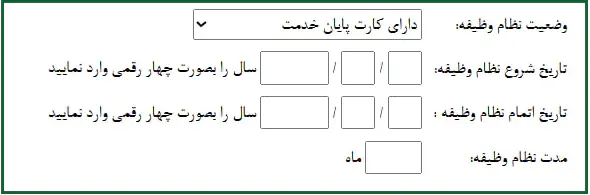 این بخش مربوط به اطلاعات نظام وطیفه (ویژه آقایان) است که باید در آن اطلاعاتی مانند وضعیت نظام وظیفه، تاریخ شروع و پایان خدمت و مدت خدمت نظام وظیفه را وارد نمایید.