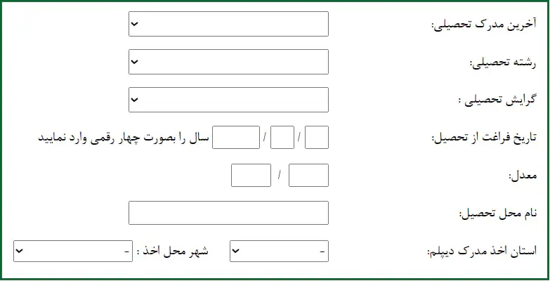 در این بخش باید اطلاعات سوابق تحصیلی خود شامل آخرین مدرک تحصيلي، رشته و گرایش تحصیلی، تاريخ فراغت از تحصيل و.. را وارد نمایید.
