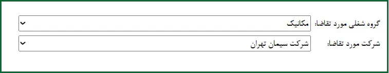 در بخش چهارم باید شغل و شرکت محل تقاضا را از بین گزینه‌های موجود انتخاب نمایید.