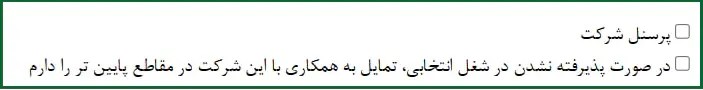 در این بخش باید مشخص کنید که اگر در شغل موردنظر پذیرفته نشدید، مایل به همکاری در دیگر موقعیت‌های شغلی شرکت هستید یا خیر.