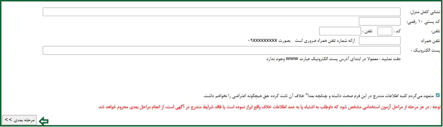 ر این قسمت باید اطلاعات تماس و محل سکونت خود، شامل نشانی منزل، کد پستی، تلفن و... را وارد کرده و سپس تیک مربوط به صحت اطلاعات را فعال کنید. در ادامه روی دکمه "مرحله بعدی" کلیک نمایید.
