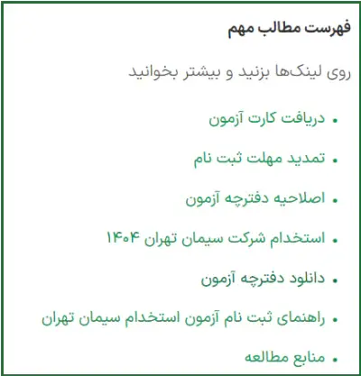تبصره 6: شرکت در آزمون برای داوطلبان از سراسر کشور مجاز می باشد لیکن سیمان تهران هیچگونه امکاناتی برای اسکان پذیرفته شدگان در آزمون ندارد.