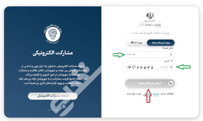 پس از کلیک بر روی ورود از طریق دولت من، صفحه زیر برای شما نمایش داده خواهد شد. شماره همراه و کد امنیتی نمایش داده شده را وارد کنید و بر روی دکمه "ارسال رمز یکبار مصرف" کلیک نمایید.