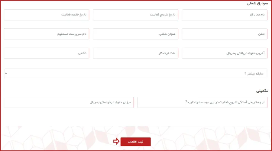 در این بخش، اطلاعات مربوط به سوابق شغلی و تکمیلی خود شامل نام محل کار، تاریخ شروع فعالیت، تاریخ آمادگی برای شروع به کار و.. را وارد کرده و سپس روی دکمه "ثبت اطلاعات" کلیک نمایید.