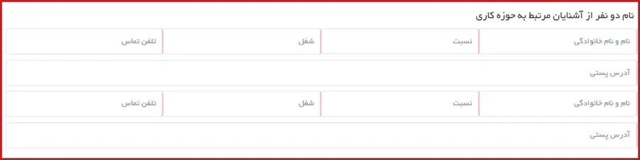 این بخش مربوط به آشنایان مرتبط با حوزه کاری است و لازم است اطلاعاتی مانند نام و نام خانوادگی، نسبت، شغل و.. را وارد نمایید.