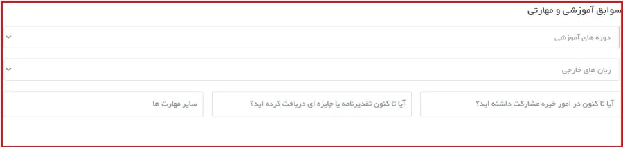این بخش مربوط به سوابق آموزشی و مهارتی است که لازم است اطلاعاتی مانند دورههای آموزشی گذرانده شده، زبانهای خارجی، مشارکت در امور خیریه و.. را وارد نمایید.