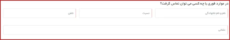 در این بخش، اطلاعات افراد قابل تماس در مواقع اضطراری شامل نام و نام خانوادگی، نسبت، شماره تلفن و نشانی را وارد نمایید.