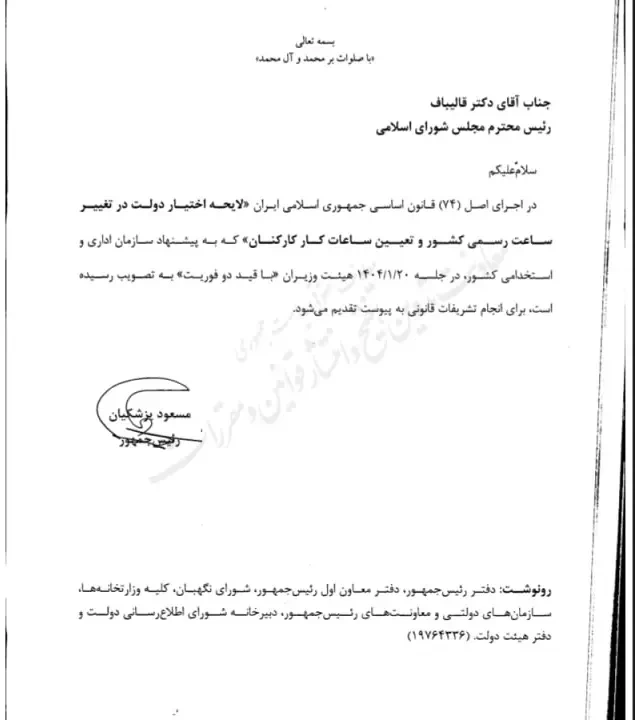 لایحه اختیار دولت در تغییر ساعت رسمی کشور و تعیین ساعات کار کارکنان با شماره ۱۲۱۲۴ در تاریخ ۱۴۰۴/۰۱/۳۱ و با امضای مسعود پزشکیان رئیسجمهور برای انجام تشریفات قانونی به مجلس شورای اسلامی ارسال شده است. در ادامه تصویر لایحه پیوست شده است.