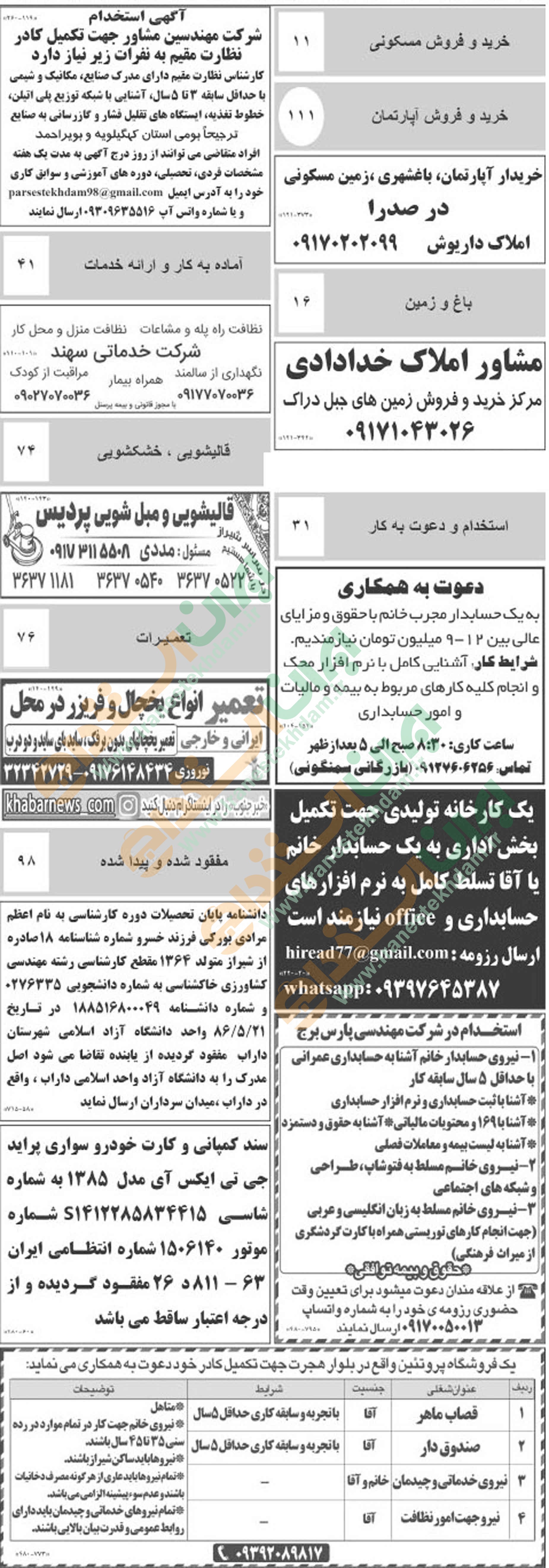 روزنامه استخدامی فارس و شهر شیراز | چهارشنبه ۱۲ مرداد ۱۴۰۱