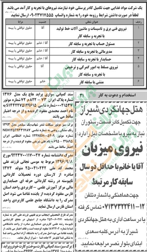 همچنین برای مشاهده صفحه نیازمندی های استخدامی استان فارس اینجا کلیک نمایید