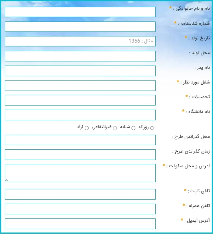در این مرحله، صفحهای مشابه تصویر زیر در قالب فرم استخدام نمایش داده میشود که در آن باید اطلاعات هویتی، تحصیلات، وضعیت گذراندن طرح خدمت و.. را وارد نمایید.