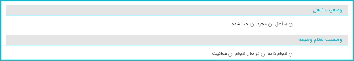 در این مرحله از فرم، باید وضعیت تاهل و نظام وظیفه خود را از بین گزینههای موجود انتخاب نمایید.