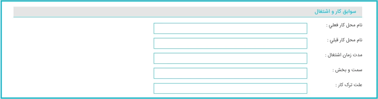 در این مرحله از فرم، باید اطلاعاتی از جمله نام محل کار قبلی و فعلی، مدت زمان اشتغال، عنوان شغلی و.. را وارد نمایید.