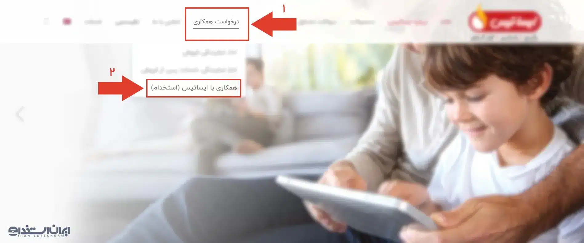 برای ارسال درخواست همکاری با شرکت ایساتیس ابتدا به وبسایت اصلی این شرکت مراجعه کرده و از نوار بالای صفحه، گزینه “درخواست همکاری” را انتخاب کنید. سپس از منوی بازشده روی گزینه “همکاری با ایساتیس” کلیک نمایید.