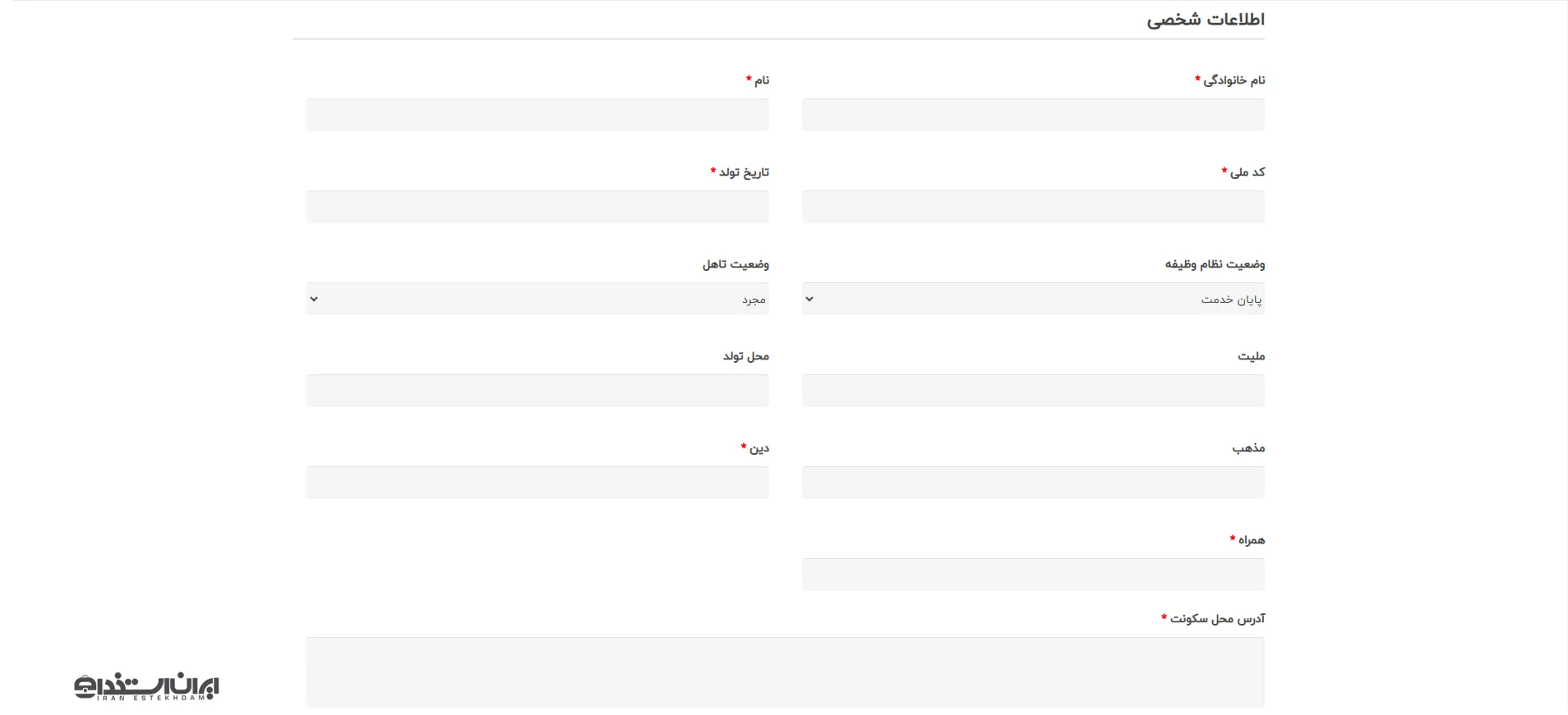 با کلیک روی گزینه “همکاری با ایساتیس” به صفحهای هدایت میشوید که باید اطلاعات شخصی خود شامل نام و نام خانوادگی، کد ملی، تاریخ تولد، وضعیت تاهل و سایر جزئیات مورد نیاز را وارد کنید.