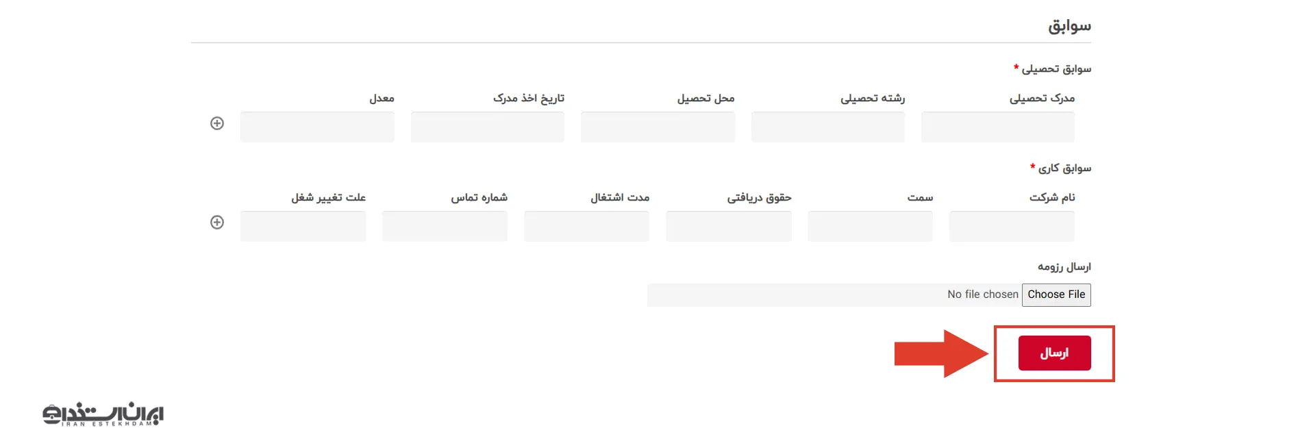 بخش بعدی فرم مربوط به سوابق تحصیلی و کاری است. در این قسمت باید اطلاعاتی مانند مدرک تحصیلی، رشته تحصیلی، محل تحصیل و سوابق کاری شامل نام شرکت، سمت و حقوق دریافتی را وارد کنید. سپس رزومه خود را در بخش مربوطه بارگذاری کرده و روی گزینه”ارسال” کلیک نمایید.