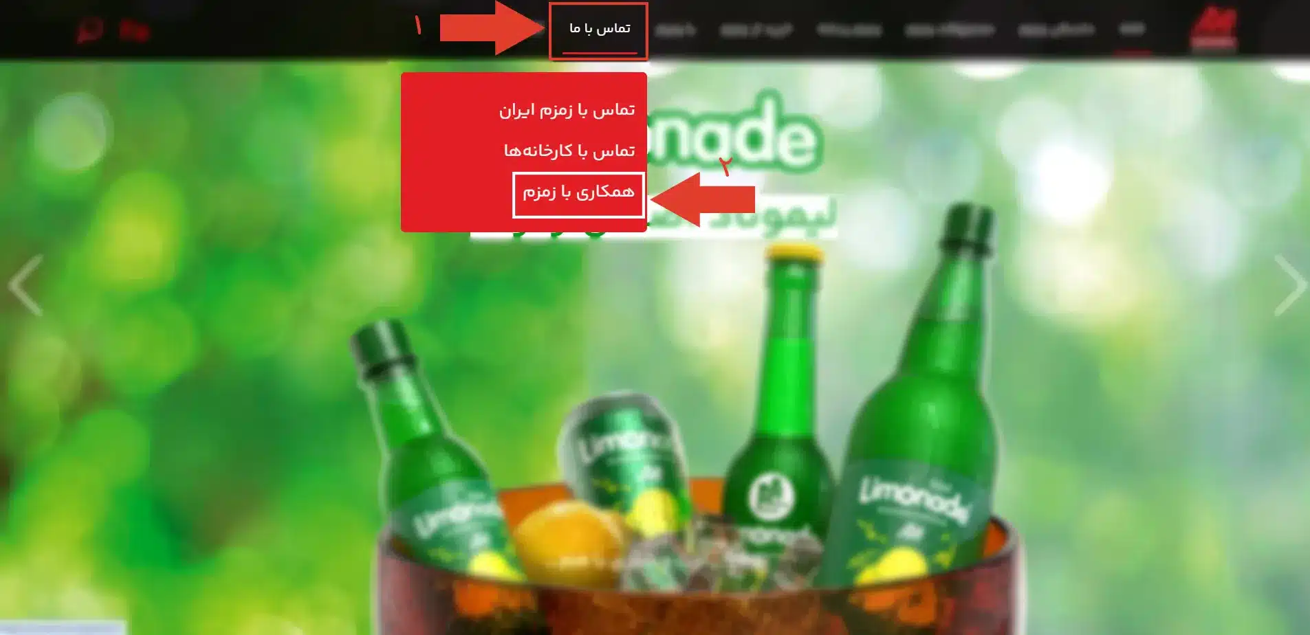 برای ارسال درخواست همکاری با شرکت زمزم ایران ابتدا باید وارد صفحه اصلی وبسایت رسمی این شرکت به آدرس zamzam.ir شوید. سپس روی گزینه تماس با ما کلیک کرده و بخش همکاری با زمزم را انتخاب کنید.
