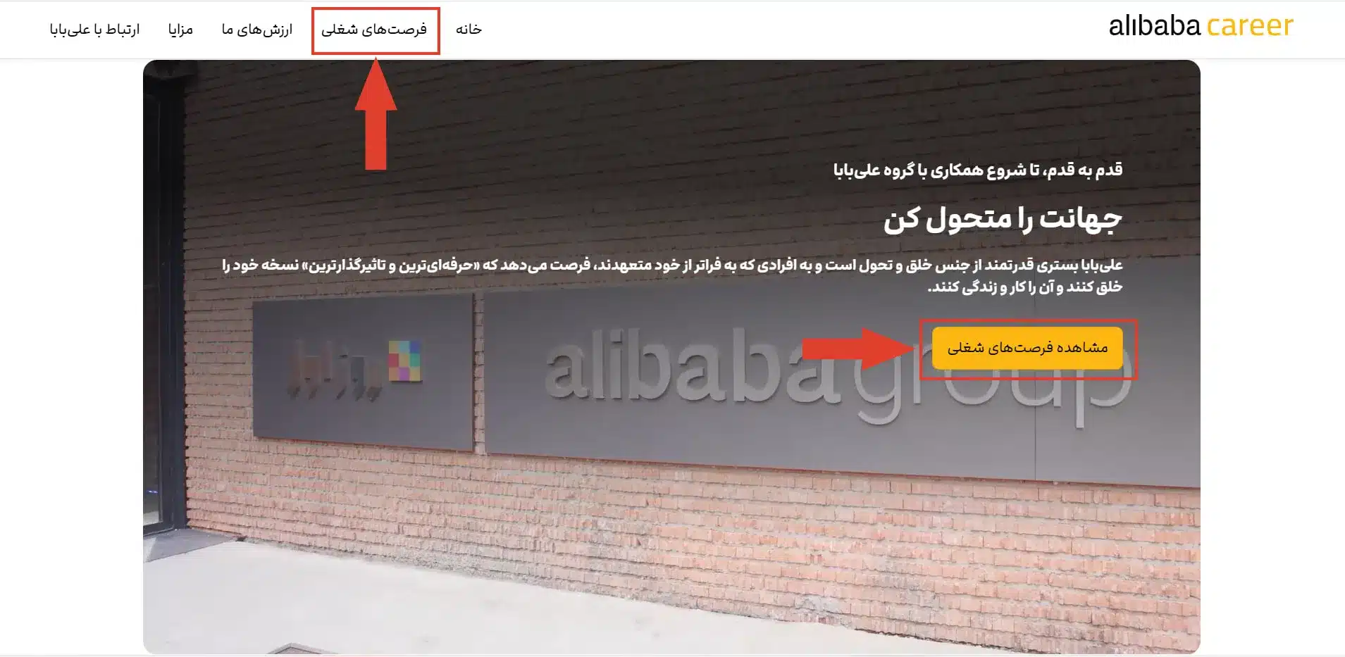 برای ثبت درخواست همکاری با شرکت علی بابا ابتدا به وبسایت رسمی این شرکت مراجعه کرده و سپس در انتهای صفحه بر روی گزینه “فرصتهای شغلی” کلیک کنید. پس از آن، مراحل بعدی را مطابق با تصاویر زیر پیش ببرید.