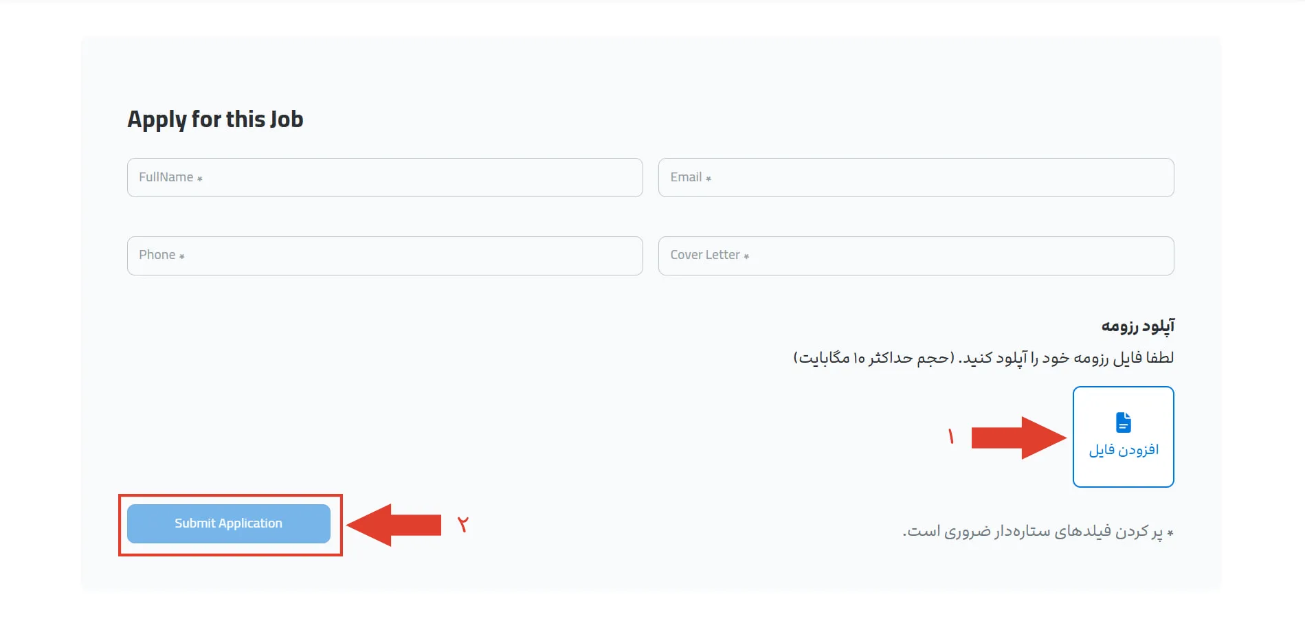 در این مرحله، تمامی موقعیتهای شغلی موجود به شما نمایش داده میشود. سپس با کلیک بر روی شغل دلخواه، وارد صفحه جزئیات آن خواهید شد. در انتهای صفحه، فرم استخدام قرار دارد که شامل اطلاعات ضروری مانند نام، شماره موبایل، ایمیل و رزومه شماست. کافی است این اطلاعات را با دقت تکمیل کرده و رزومهتان را بارگذاری کنید. در نهایت با کلیک بر روی گزینه “Submit Application”، درخواست شما ثبت خواهد شد.
