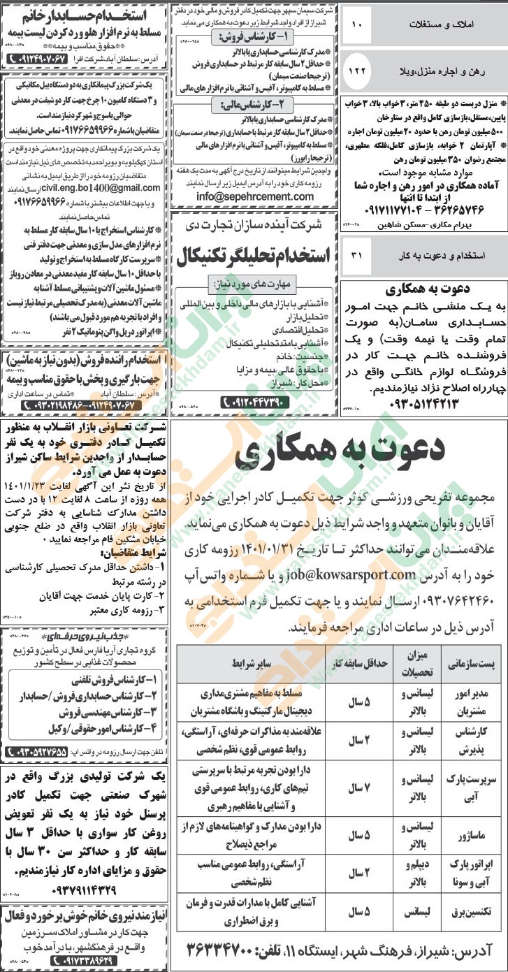 روزنامه استخدامی فارس و شهر شیراز | چهارشنبه ۱۷ فروردین ۱۴۰۱