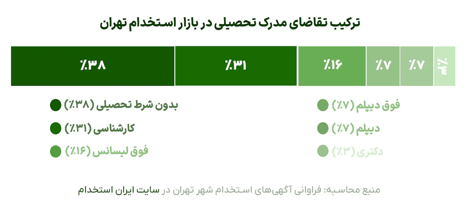 بیشترین سهم تقاضای جذب نیروی انسانی در بازار کار تهران، به تفکیک مقاطع تحصیلی، براساس بررسی مجموع آگهیهای منتشرشده در سایت ایران استخدام، به شرح زیر است: