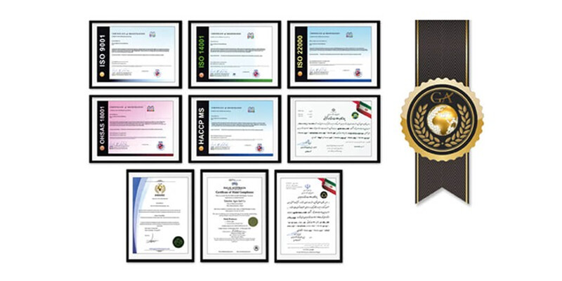با توجه به این که هدف اصلی این مجموعه تولید محصولات با كيفيت میباشد فرایند تولید محصول در این مجموعه از مزرعه تا زمانى كه محصول در دسترس مصرف کنندگان قرار میگيرد مطابق با استانداردهاى جهانی انجام میپذیرد.