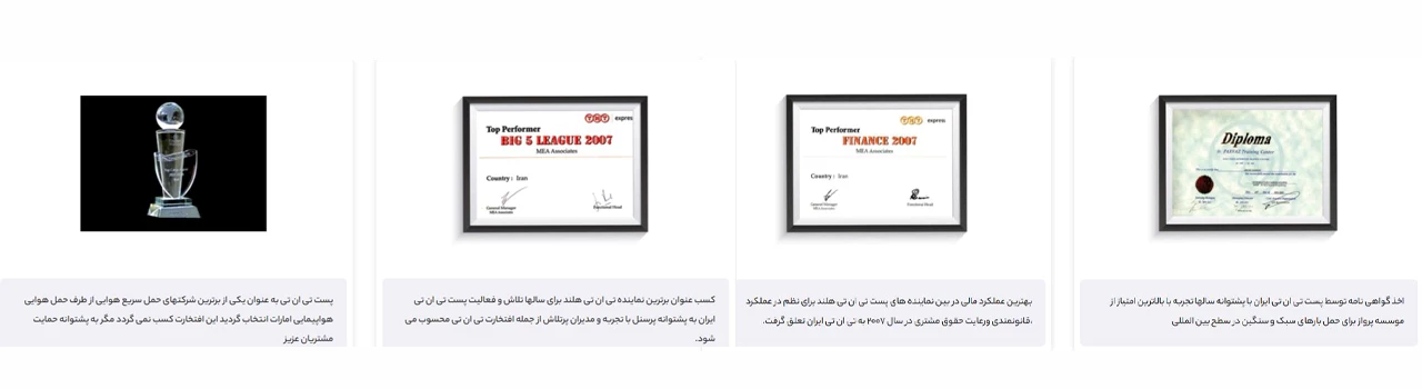 شرکت تیاِنتی (TNT) از سال ۱۹۸۰ فعالیت خود را در ایران آغاز کرده و در طی دههها با رشد مستمر و گسترش خدمات، به یکی از نامهای معتبر در حوزه پست سریع و حملونقل بینالمللی تبدیل شده است. این مجموعه با پوشش سراسری، دفاتر فعال در شهرهای مختلف و تکیه بر فناوریهای نوین، به عنوان یک پست بینالمللی هوشمند ایرانی در مسیر توسعه و خدمترسانی گسترده به مشتریان خود گام برمیدارد.