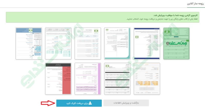 پس از تکمیل اطلاعات مربوطه بر روی "کلید ثبت و ادامه" بزنید. قالب رزومه خود را انتخاب و برای دریافت، کلیک نمایید.
