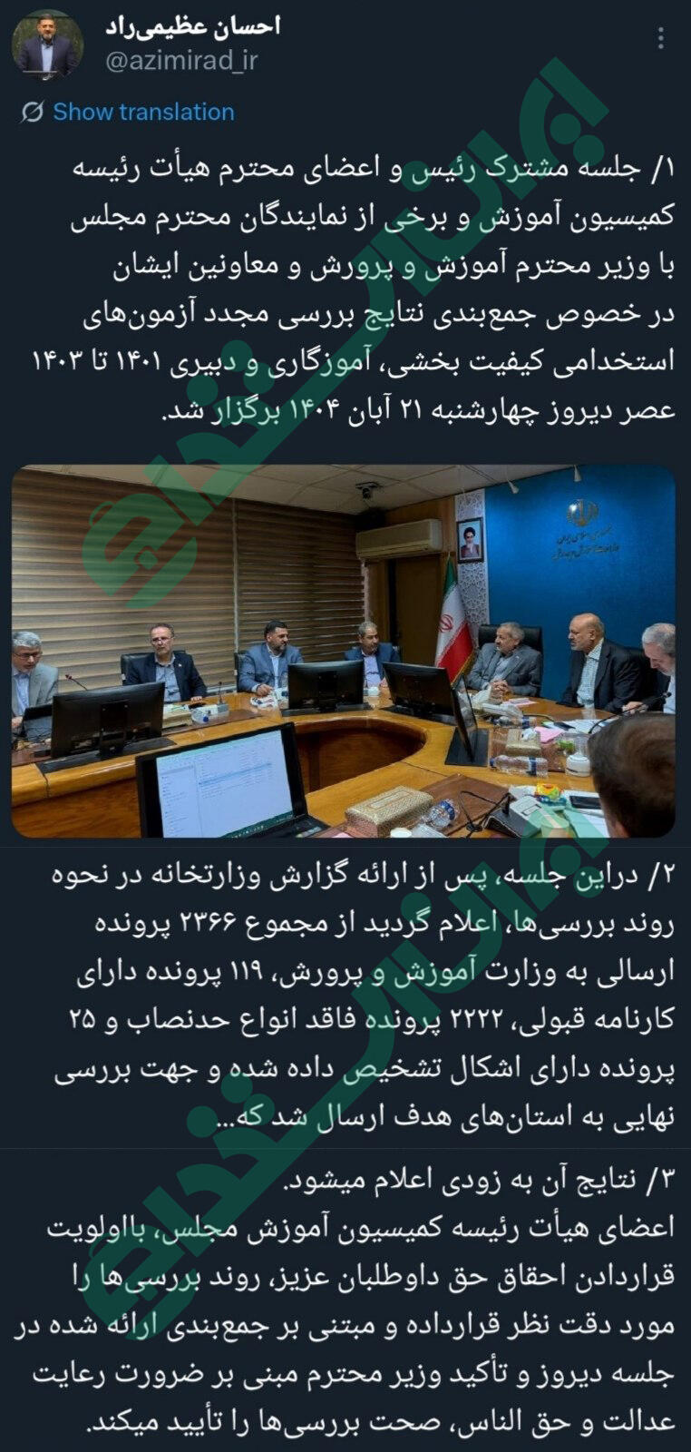 خبر 24 آبان 1404: سخنگوی کمیسیون آموزش و تحقیقات مجلس شورای اسلامی: جلسه مشترک رئیس و اعضای هیأت رئیسه کمیسیون آموزش و برخی از نمایندگان مجلس با وزیر آموزش و پرورش و معاونین ایشان در خصوص جمع بندی نتایج بررسی مجدد آزمونهای استخدامی کیفیت بخشی، آموزگاری و دبیری 1401 تا 1403 عصر چهارشنبه 21 آبان 1404 برگزار شد.